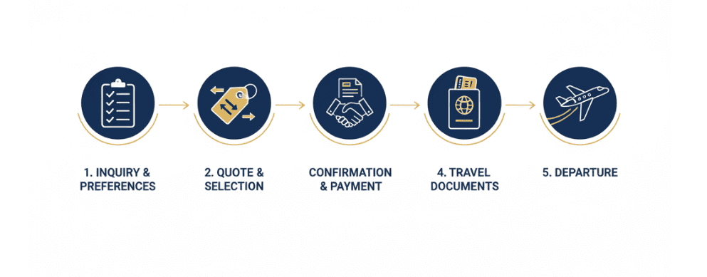 한국 출발 전용기 예약은 생각보다 체계적인 프로세스를 따릅니다. 아래 다섯 단계를 거치면, 첫 전용기 예약도 어렵지 않게 진행할 수 있습니다.